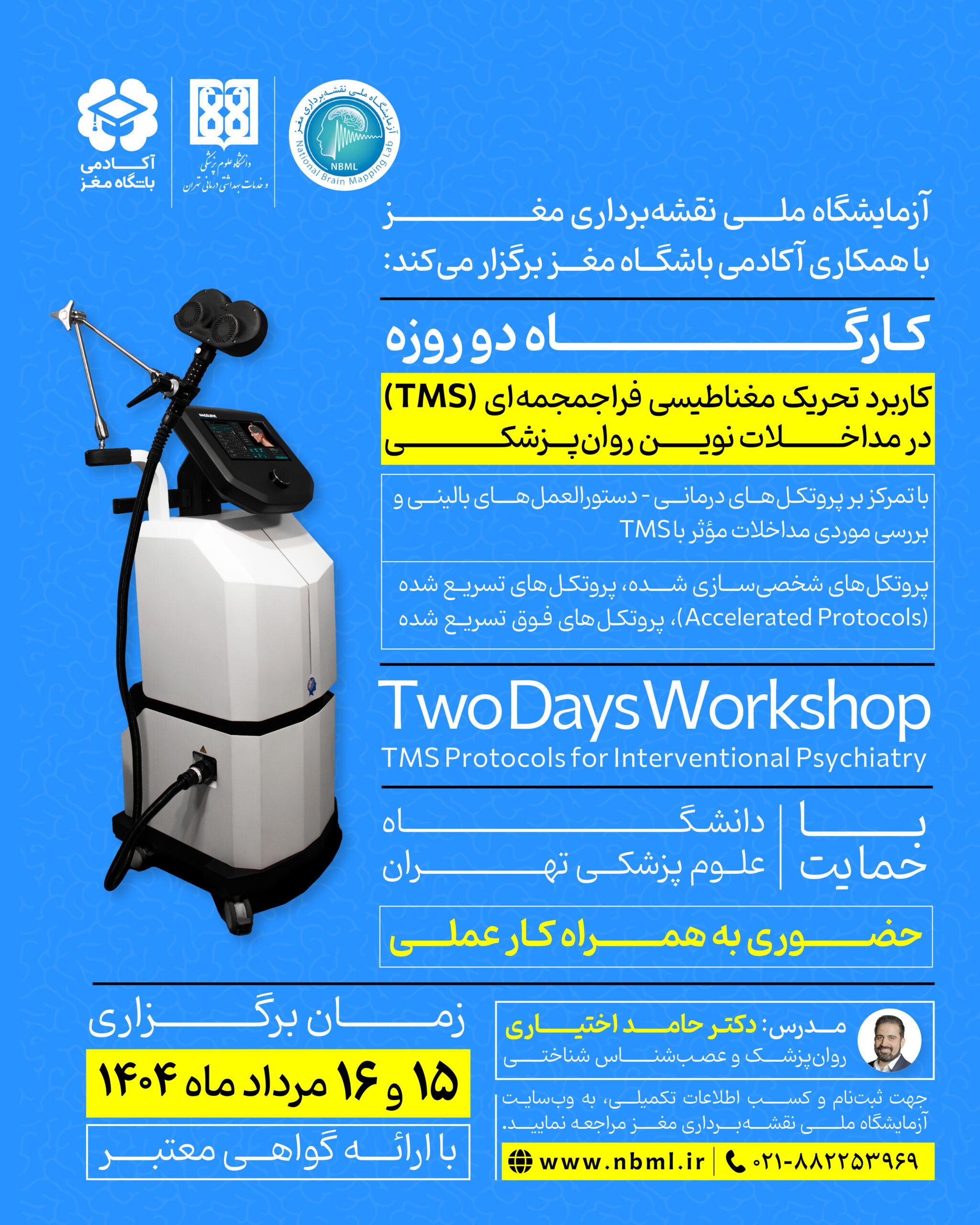 کارگاه دو روزه کاربرد تحریک مغناطیسی فراجمجمهای (TMS) در مداخلات نوین روانپزشکی با تمرکز بر پروتکلهای درمانی – دستورالعملهای بالینی و بررسی موردی مداخلات مؤثر با TMS