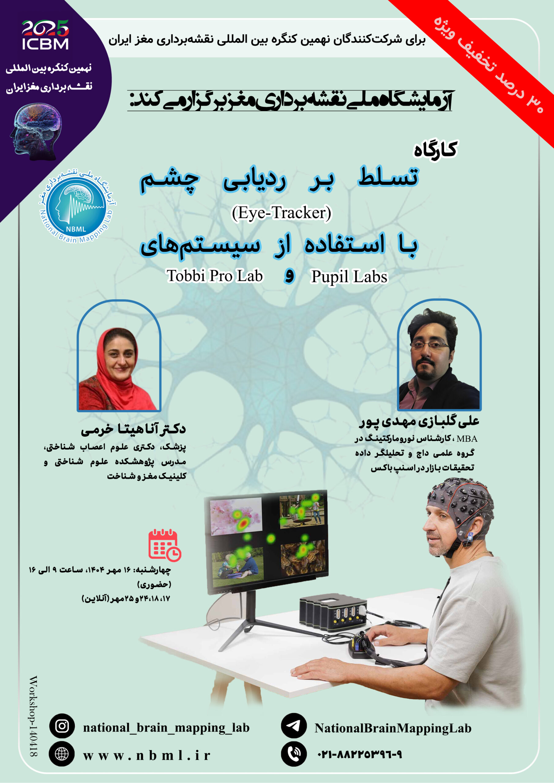 این کارگاه آموزشی که بهصورت مشترک توسط دکتر آناهیتا خرمی (علوم اعصاب شناختی) و علی گلبازی مهدیپور (متخصص ردیابی چشم و تحلیل داده) برگزار میشود، آموزش عملی ردیابی چشم با استفاده از سیستمهای Pupil Labs و تحلیل دادهها در R را ارائه میدهد. یک جلسه اختصاصی نیز به معرفی نرمافزار Tobii Pro Lab برای مقایسه رویکردهای مبتنی بر صفحه نمایش میپردازد. شرکت کنندگان مهارتهای کاربردی در حوزههای علوم شناختی، پژوهش تجربه کاربری و مطالعات بالینی را کسب خواهند کرد.